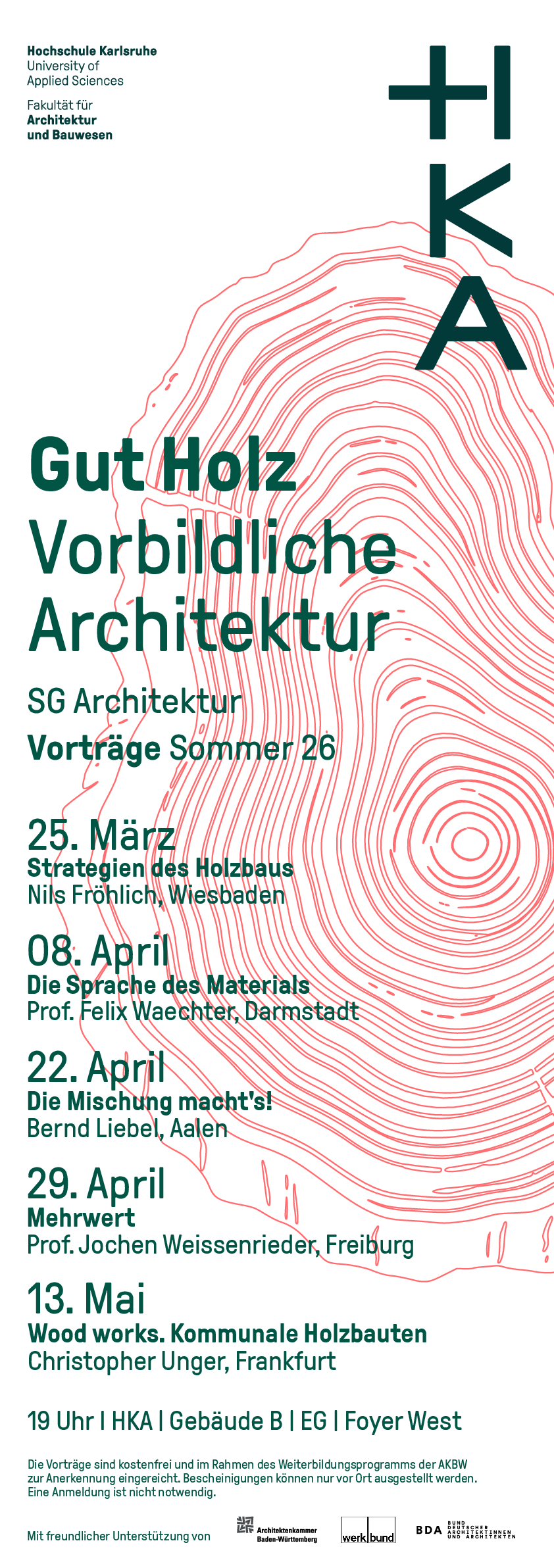 Die Vorträge sind kostenfrei und im Rahmen des Weiterbildungsprogramms der Architektenkammer Baden-Württemberg (AKBW) anerkannt. Bescheinigungen werden nur vor Ort ausgestellt. Eine Anmeldung ist nicht notwendig.