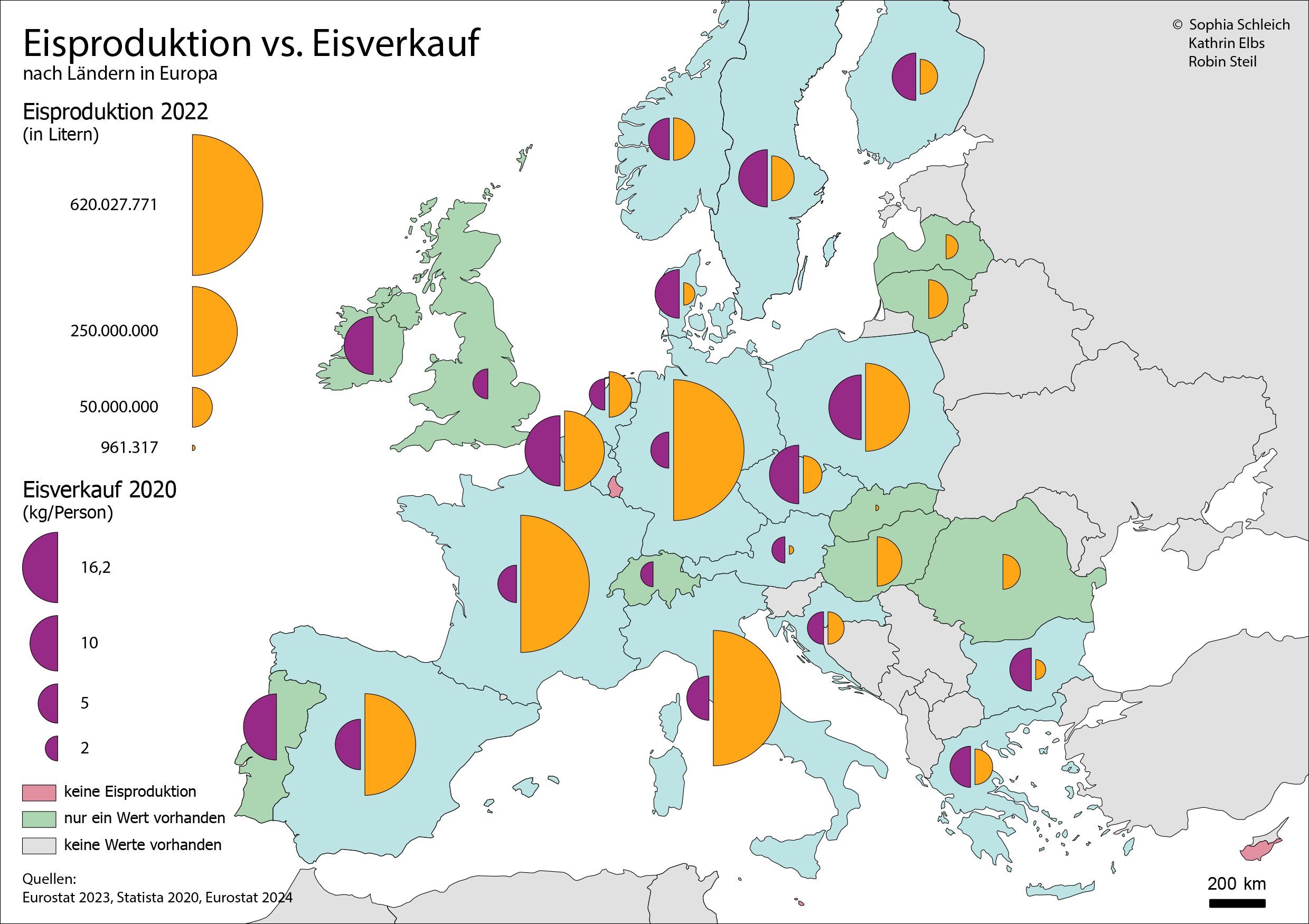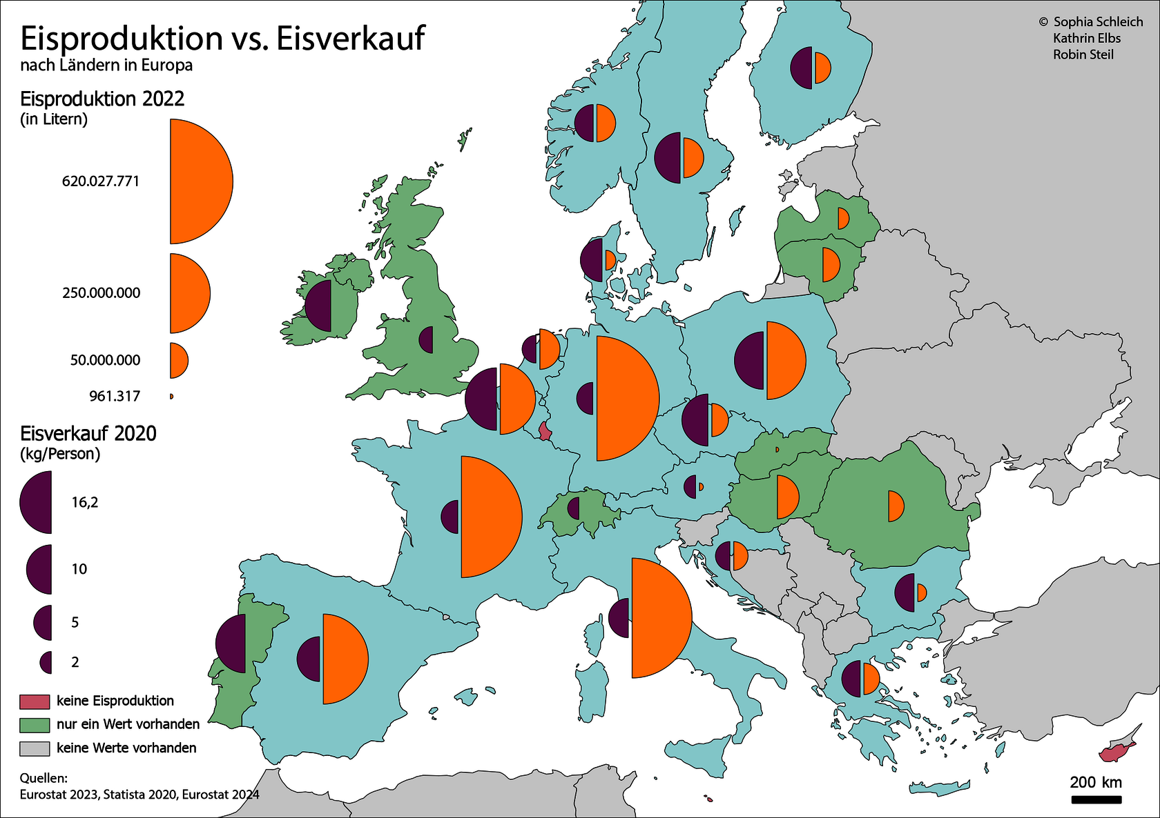 Betrachten wir als nächstes die Eisproduktion: Kann es sein, dass dort produziert wird, wo es einen großen Eishunger gibt? Grafisch gefragt: Fallen der orangene und der lila Halbkreis häufig so zusammen, dass sie gemeinsam einen passenden Kreis bilden, also in ihrem Verhältnis zueinander ähnlich groß sind?