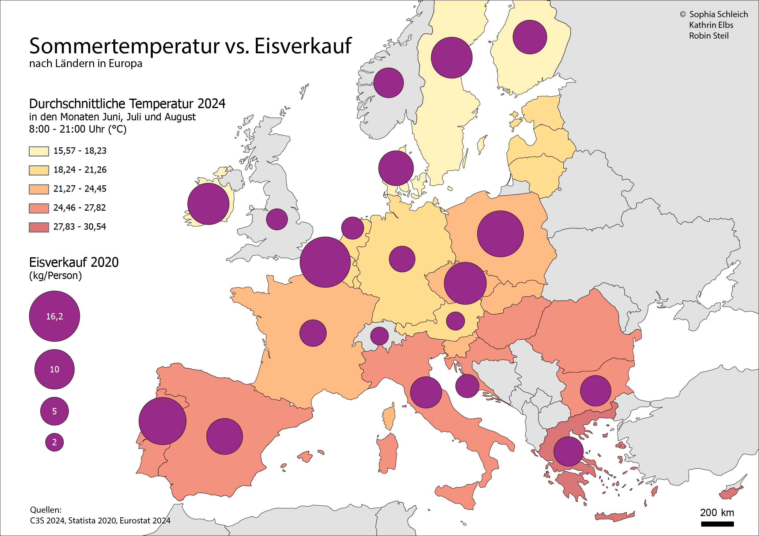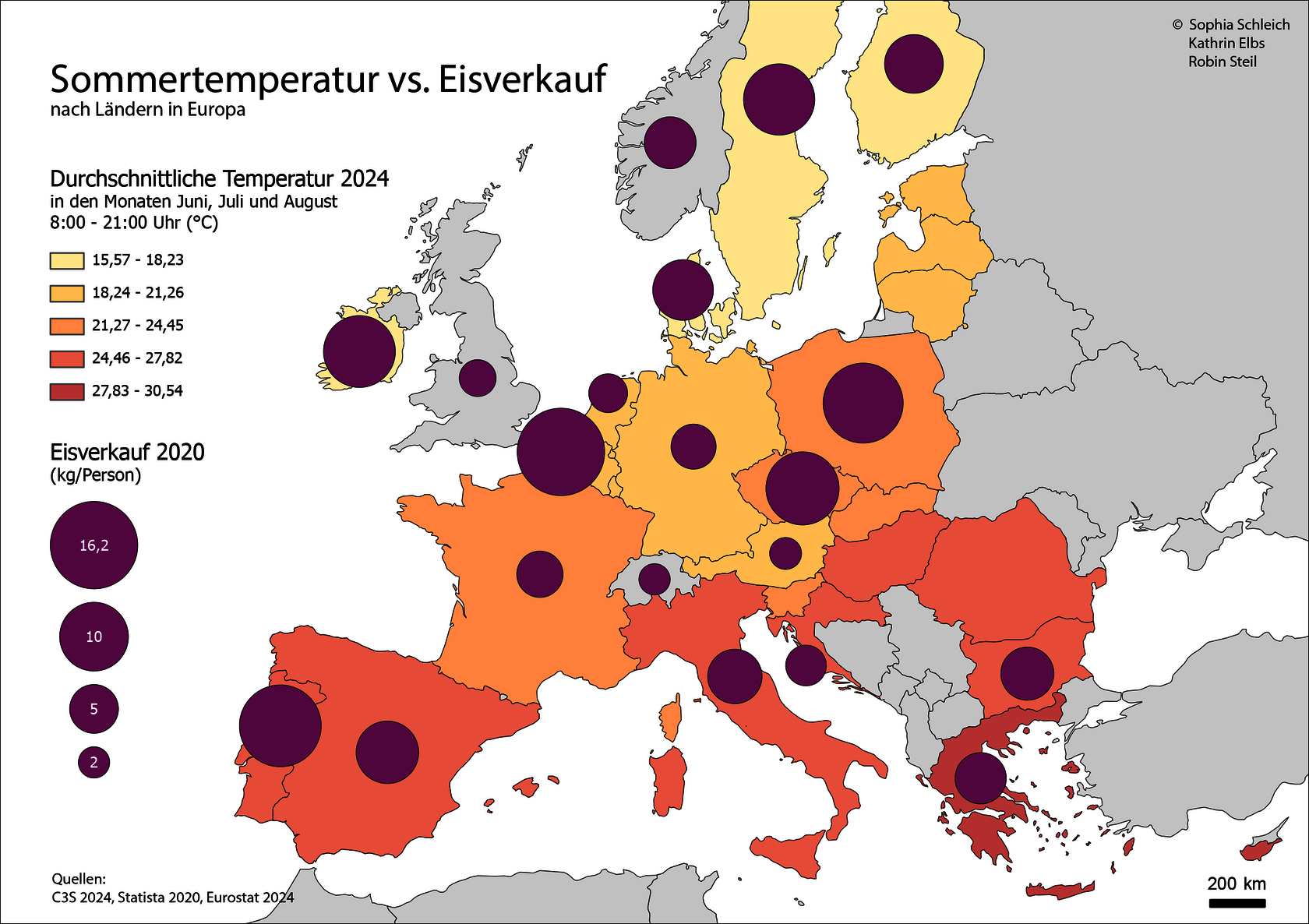 Eigentlich naheliegend etwa der Vergleich mit der durchschnittlichen Sommertagestemperatur (Juni – August, 8 – 21 Uhr) pro Land. Diese Daten liegen sogar für dasselbe Jahr vor wie die Daten zum Eisverkauf. Aber wird in heißeren Ländern wirklich mehr Eis verkauft? Vergleiche die Größe der Kreise mit der Intensität des Farbtons in der Landesfläche! Erkennst du einen Zusammenhang?