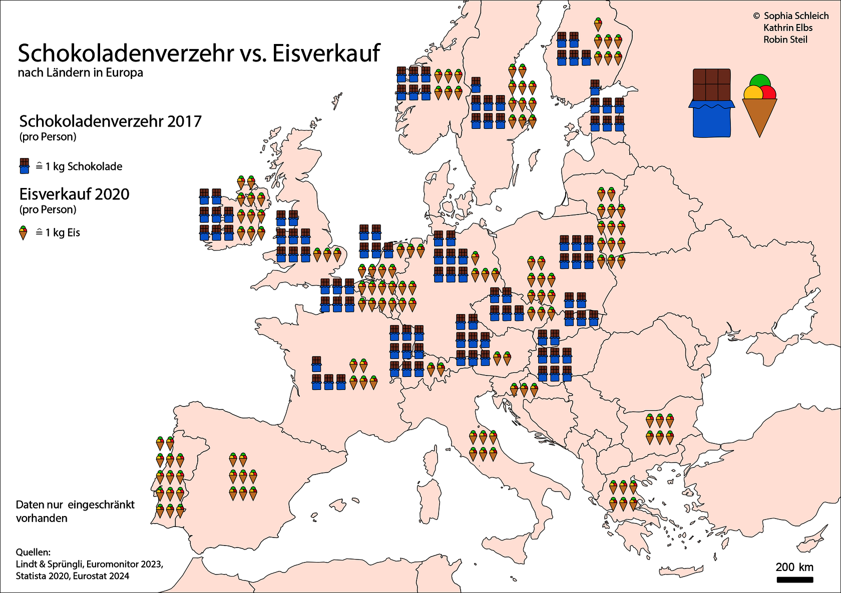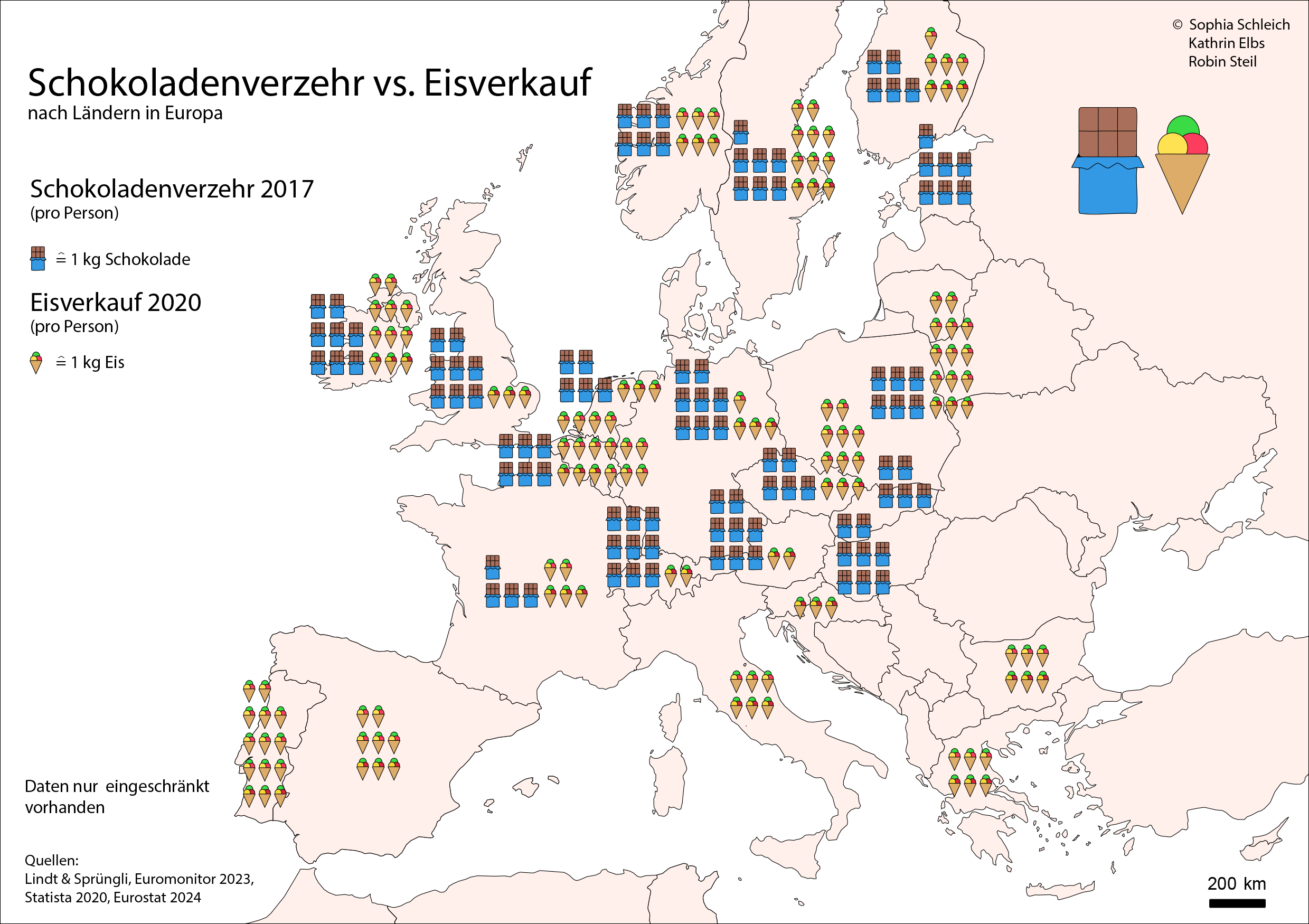 Während man sich in Norwegen etwa gleichermaßen an Schokolade und Speiseeis erfreut mit je etwa 6 kg pro Person im Jahr, scheinen die Schweizer:innen ganz auf ihre weltberühmte Schokolade zu setzen, mit fast 9 konsumierten Schokoladen-Kilogramm pro Person im Jahr! Daneben wirkt ihr Eisverzehr von nur knapp 2 kg pro Person im Jahr schon fast gesund!
