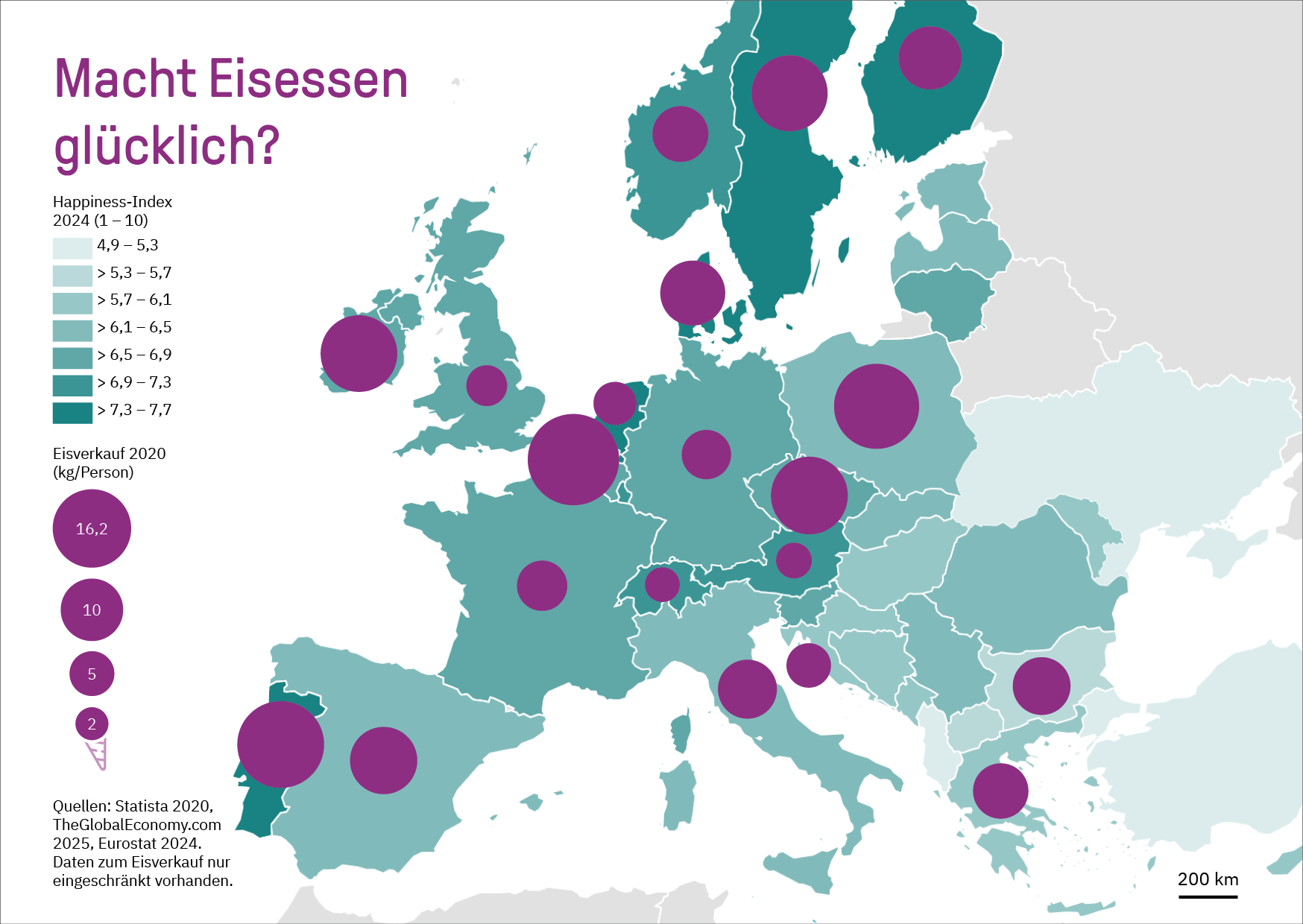 Die Karte für Europa zeigt jedoch, dass es keinen messbaren Zusammenhang zwischen Speiseeisverkauf und dem Happiness-Index gibt: Große Kreisscheiben fallen nicht überall mit den dunklen Farbtönen der Länder zusammen oder umgekehrt, kleine nicht überall mit den hellen.