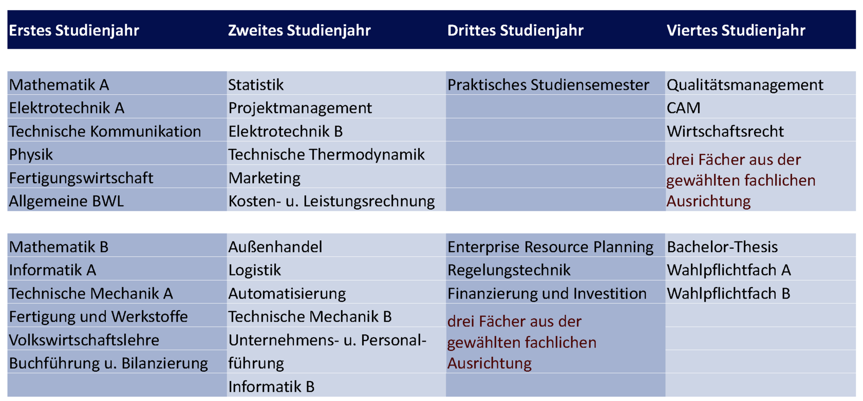 Die Regelstudienzeit des Bachelorstudiengangs Wirtschaftsingenieurwesen beträgt acht Semester. Das Studium gliedert sich in zwei Semester Grundstudium und sechs Semester Hauptstudium. Im fünften Semester ist ein Praktisches Studiensemester vorgesehen, das viele Studierende im Ausland absolvieren. Unser Praktikantenamt unterstützt die Studierenden bei der Vorbereitung und Gestaltung des Praktischen Studiensemesters.