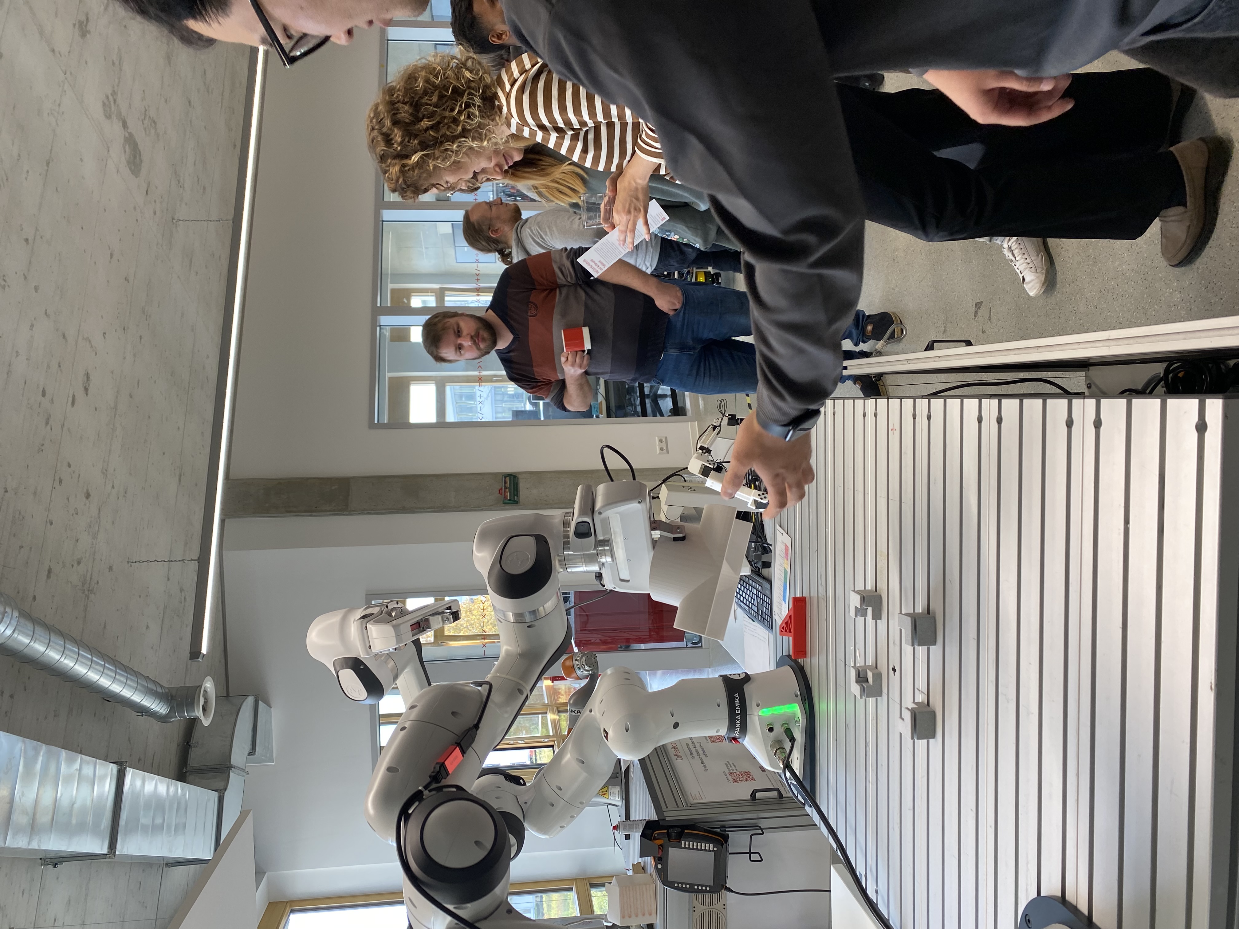 Im Mittelpunkt standen interaktive Demonstrationen aus aktuellen Industrie- und Verbundprojekten. Besonders eindrucksvoll war die Live-Vorführung des Robotikprojekts von Doktorand Yucheng Tang, das auf ein Open-Source-Projekt zurückgreift und dieses gezielt auf seinen Bedarf anpasst: Über eine externe Steuereinheit konnten so Gäste selbst einen Roboterarm bedienen und dabei ein außergewöhnlich realistisches haptisches Feedback erleben. Spürte der Roboterarm Widerstand, wurde dieser unmittelbar an die Steuerung zurückgegeben – ein eindrucksvoller Einblick in Präzision, Sensorik und sicherheitsorientierte Robotik. Große Aufmerksamkeit erhielt auch der RobotTrainer von Andreas Zachariae, der von Besucher*innen und auch Rektorin Prof. Dr. Rose Marie Beck getestet wurde.