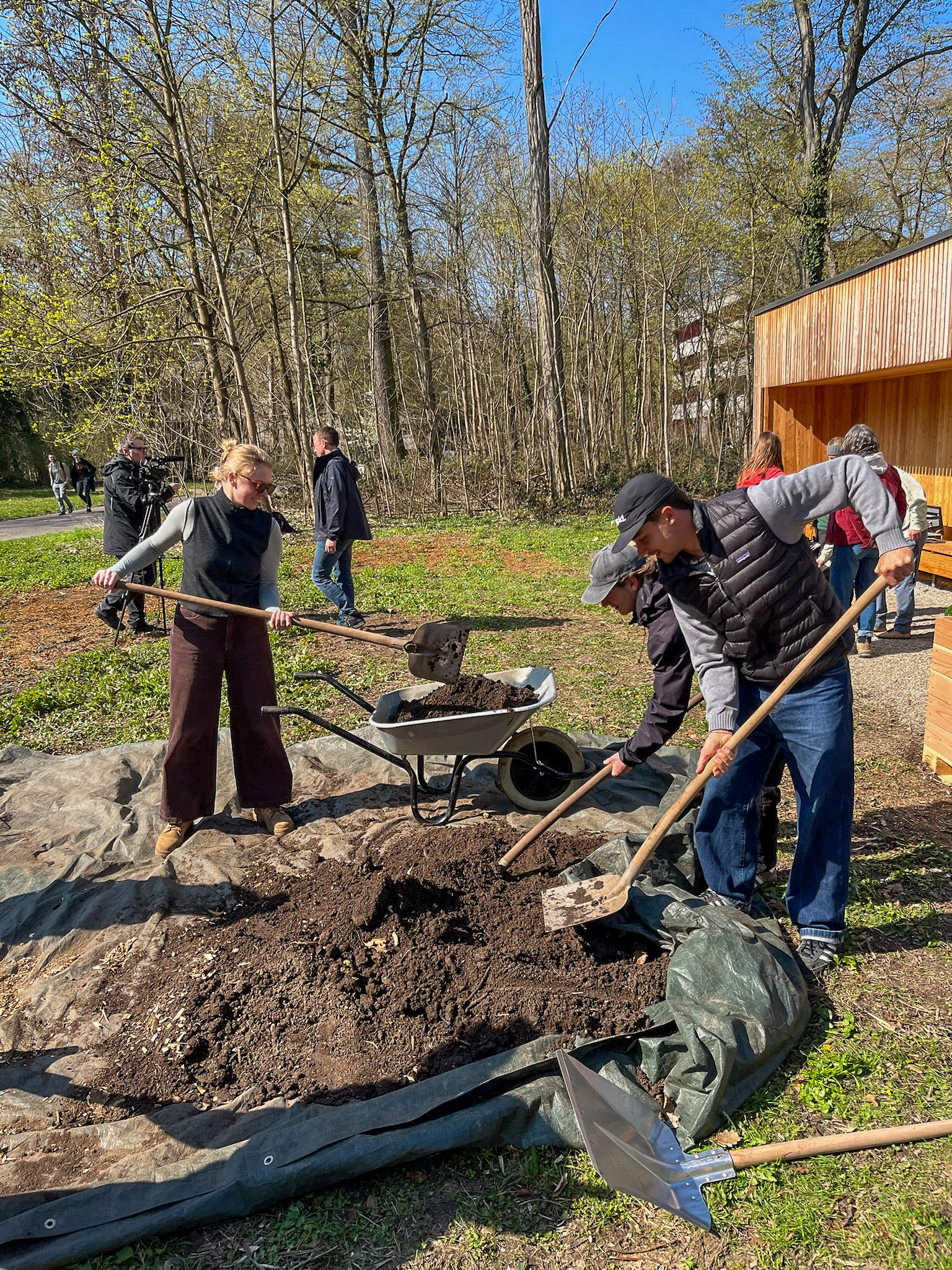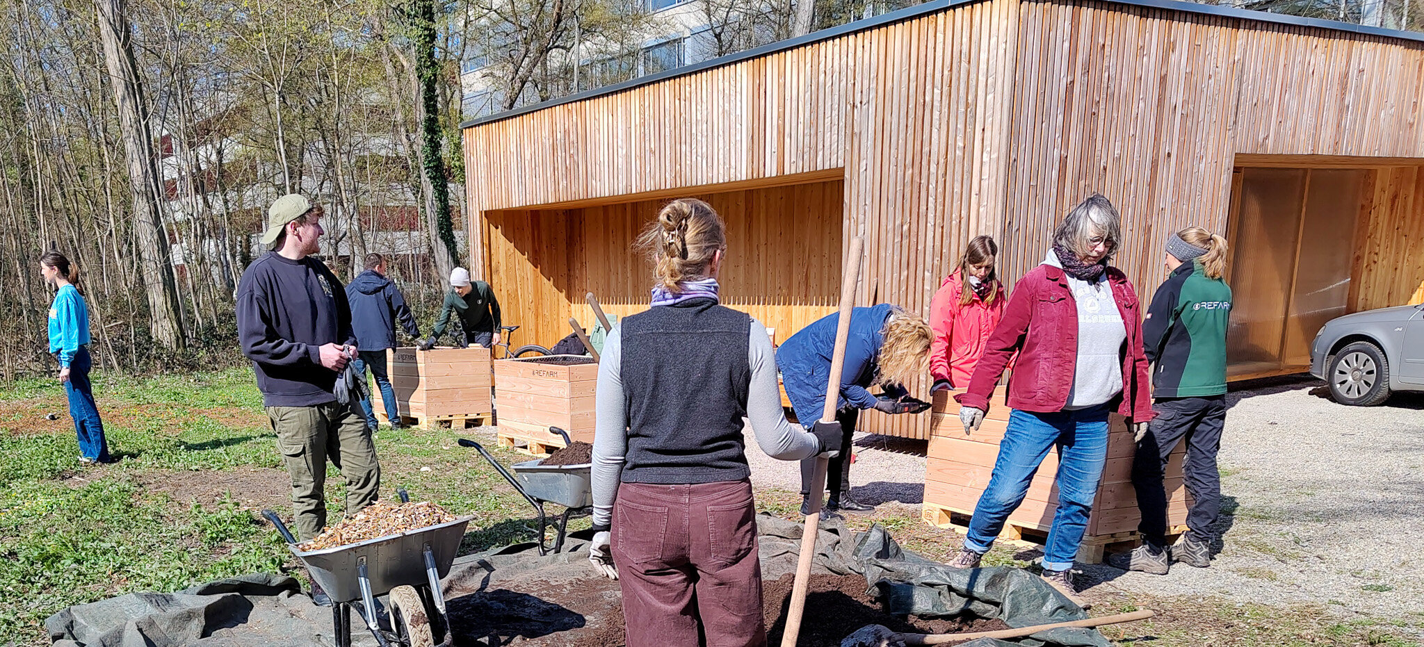 Unter Anleitung des Refarm-Teams wurden die Hochbeete an der Knielinger-Allee am E-Bike-Port der Hochschule Karlsruhe aufgebaut. In einer gemeinsamen Aktion mit Studierenden und Mitarbeitenden wurden die Beete montiert, befüllt und bepflanzt. Dabei wurden rund 2.000 Liter Material bewegt. Der praktische Einsatz wurde durch Schulungen zu Themen wie nachhaltiger Anbau, Pflanzkombinationen und Saatgut ergänzt. Insgesamt fanden die Aktionen bei allen großen Anklang.
