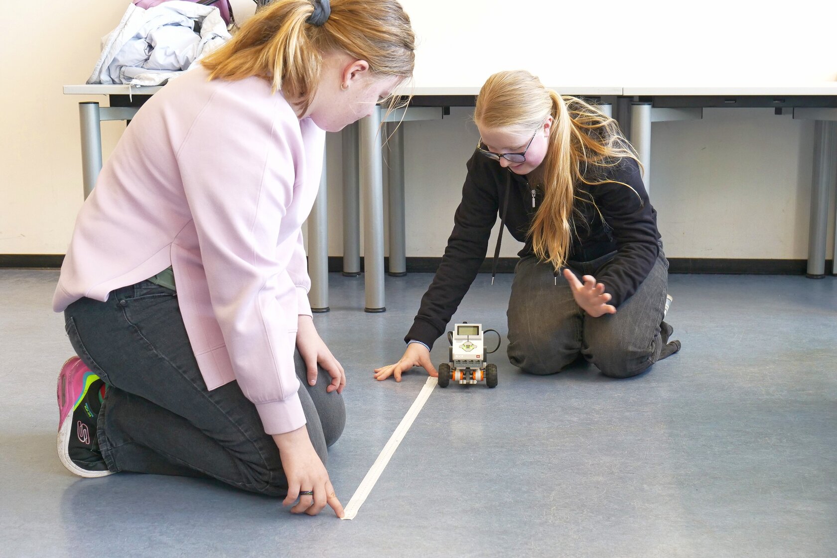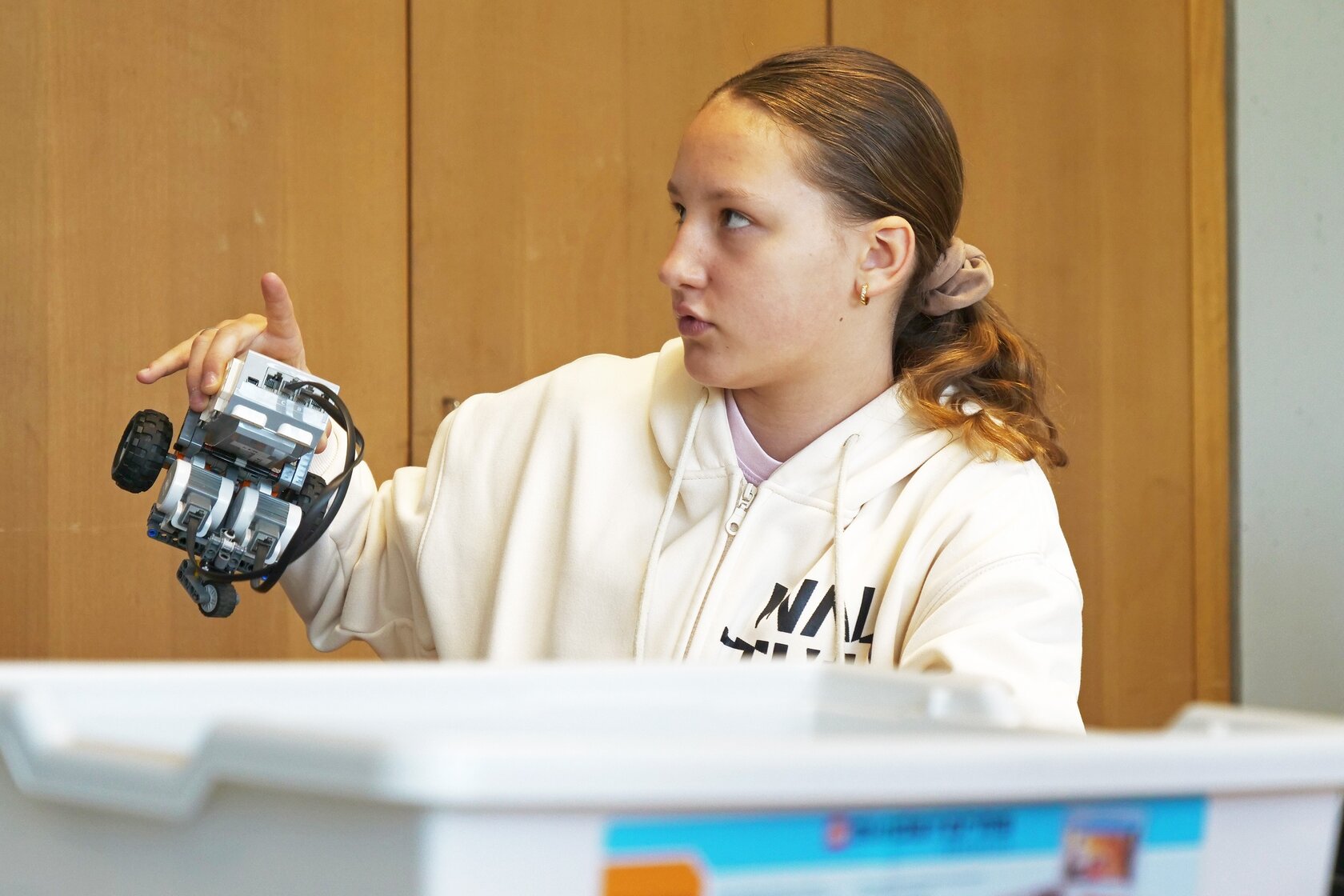 Wer den Blick in die Luft richten wollte, programmierte „Up into the Sky“, eine Forschungs-Mini-Drohne vom Typ Crazyflie, wie sie in der Robotik eingesetzt wird. Die Schülerinnen schrieben in Python eigene Programme, ließen die Drohne automatisch starten und landen und experimentierten mit Flugbahnen. Hier ging es nicht um Spielerei, sondern um eine erste Begegnung mit der Programmiersprache, die auch in KI und Raumfahrt eine zentrale Rolle spielt.