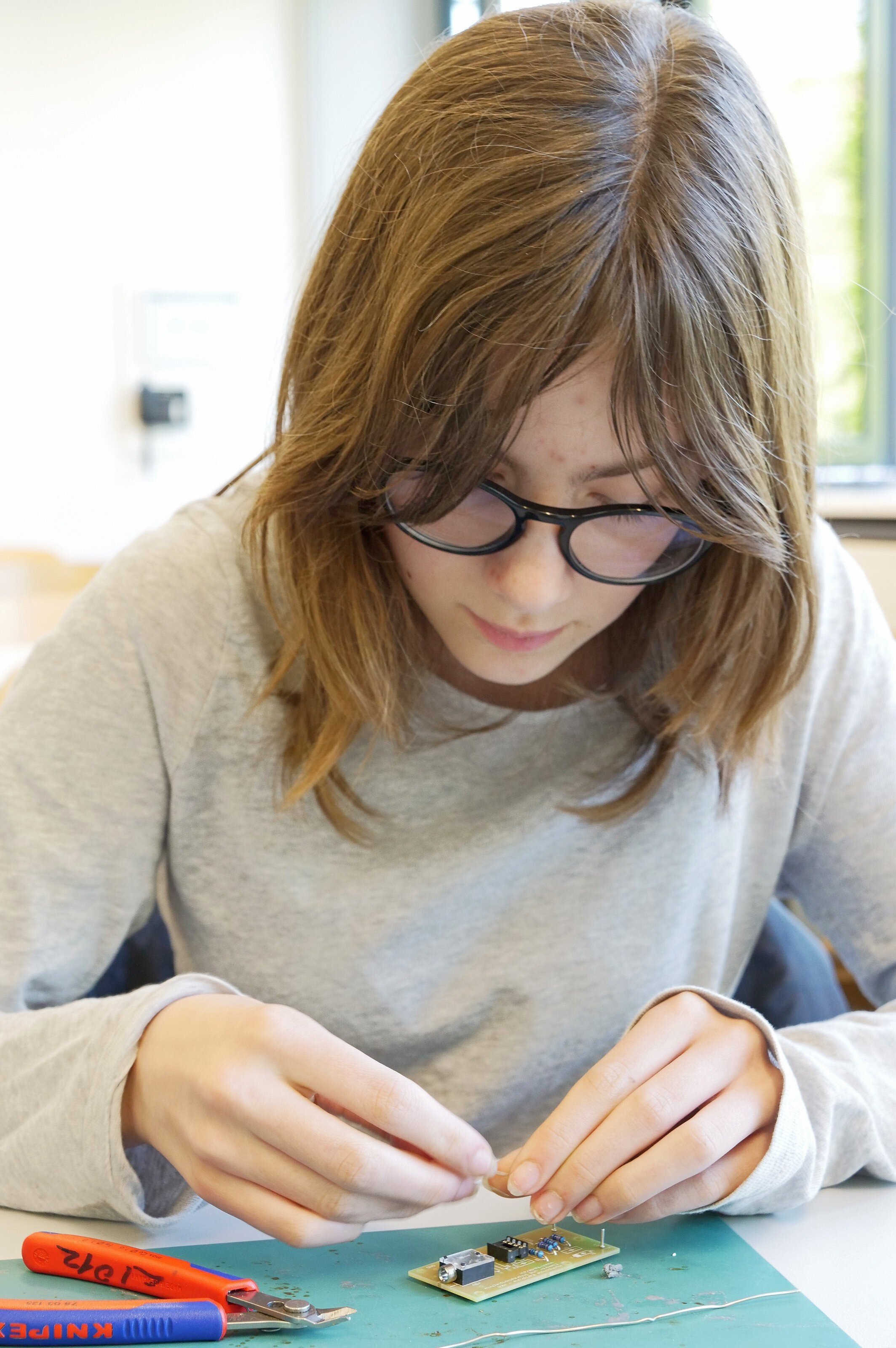 Wie allgegenwärtig Technik ist, zeigte sich im Workshop „Wir bauen einen Handy-Detektor“. Aus Bauteilen, Kabeln und etwas Geduld bauten die Schülerinnen eine Schaltung, die Handysignale aufspürt. Plötzlich waren WLAN-Router, schnurlose Telefone und Smartphones keine abstrakte „Wolke aus Strahlung“ mehr, sondern als konkrete Messgrößen hörbar. Die Botschaft: Wer versteht, wie Technik funktioniert, ist ihr nicht ausgeliefert, sondern kann sie selbst gestalten und kontrollieren.