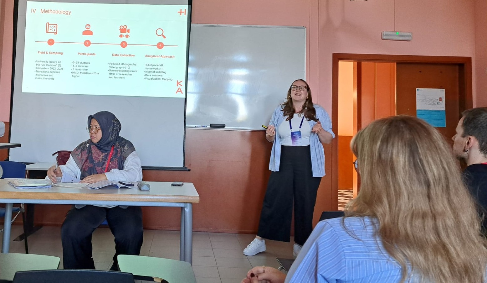 Fiona Schmidbauer presented her qualitative long-term study on the spatial positioning of students and teachers in the virtual learning space. In her videography, which she carried out over several semesters in the VR Campus, she compares spatial practices in virtual reality (VR) with those in the physical lecture hall - for example, how proximity and distance arise, how teachers and students position themselves in the space and what role spatial orientation plays for social aspects of learning. She received the Best Student Paper Award for her contribution, a special recognition of her academic work, which she developed together with co-author Matthias Wölfel.