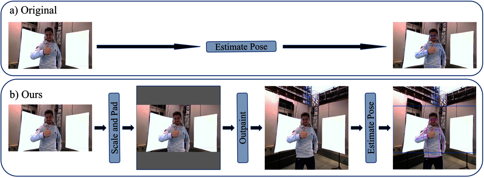 The outpainted images were then processed using an off-the-shelf pose estimator to assess the performance improvements. The evaluation was conducted on a previously captured and annotated dataset from the 3D scanner, ensuring that the results were both relevant and grounded in real-world data.