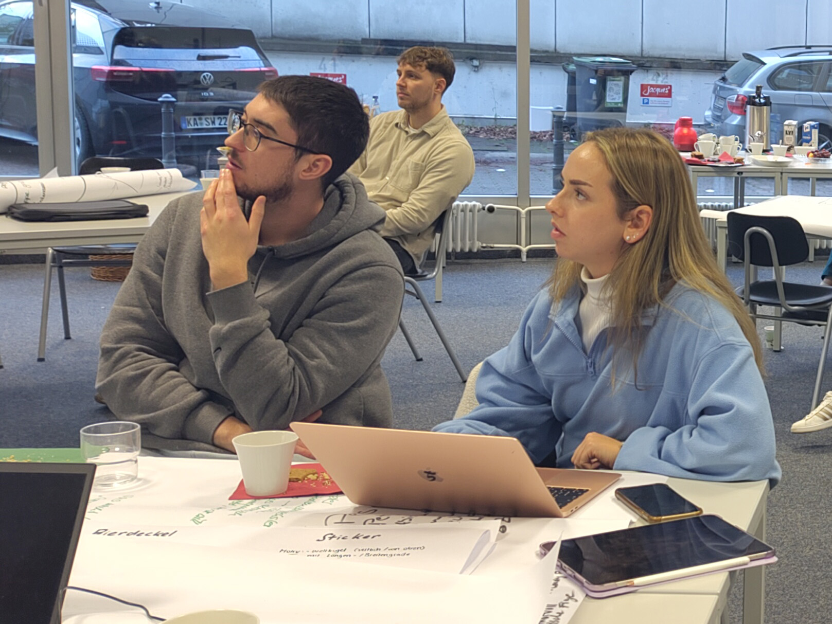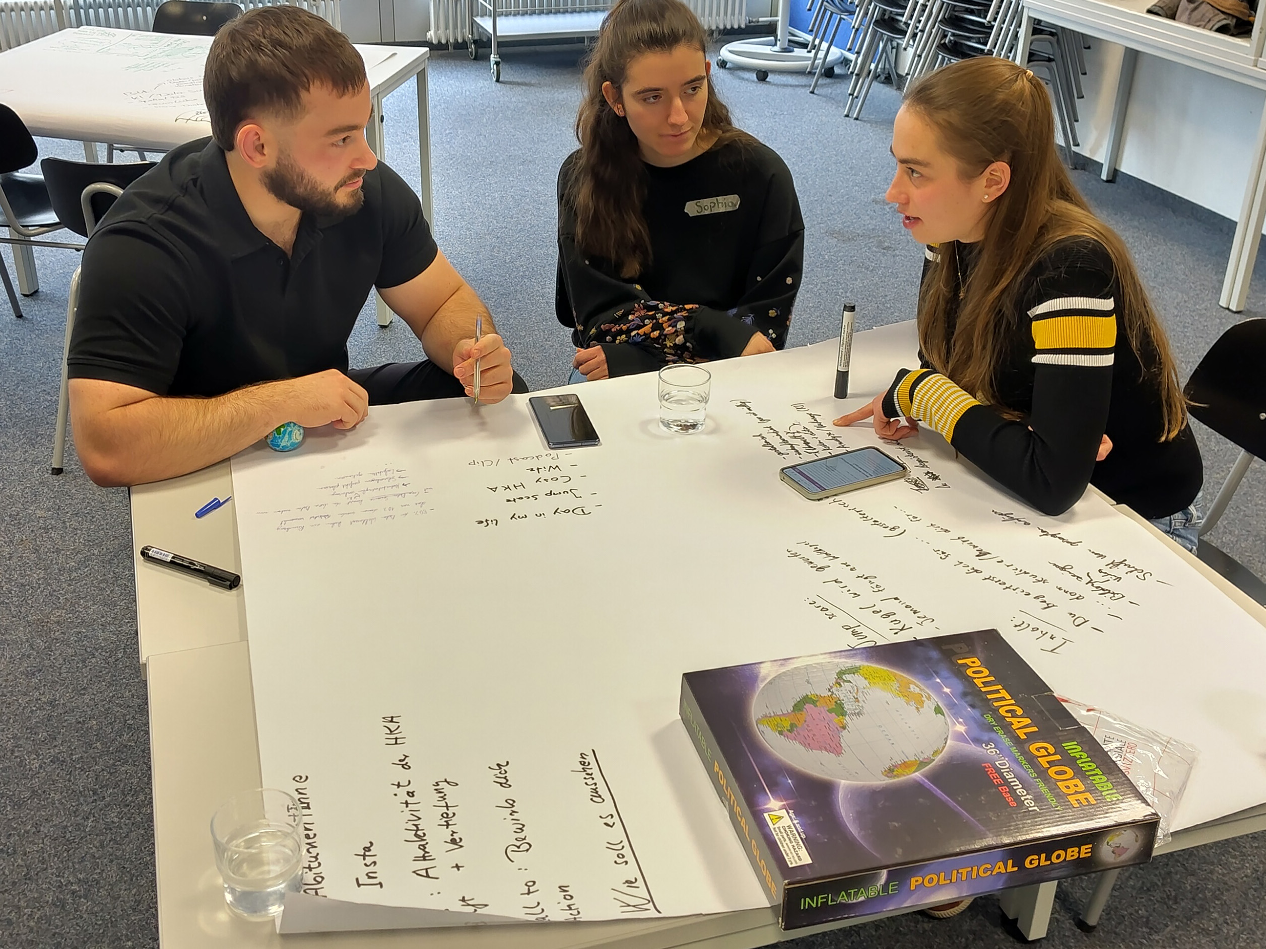 Sie hatte vier Aufgaben mit dabei und so ging es am ersten Nachmittag direkt in den Ideensprint, dies in bunt zusammengewürfelten Gruppen zu jeweils einem Medientyp. Mit viel Engagement und Spaß wurde überlegt und diskutiert – gegen Ende des ersten Nachmittags gab es an jedem der vier Tische einen Plan, woran am folgenden Nachmittag weitergearbeitet wurde. Denn da ging es an die Umsetzung: Von zwei Ideen für ein Poster, wobei zum Thema Daten – Analyse noch ein geeignetes Foto gefunden werden muss. Einem Carousel-Post, für den die Story bereits steht, bei welcher der Raumbezug von Daten letztendlich zur Studiengangswahl führt. Zum Guerillamarketing sind zwei Ideen entstanden, u.a. einem Sticker, die andere Idee wird hier noch nicht verraten. Mit beiden soll aufgezeigt werden, dass die Vertiefungsrichtung keine Spezialisierung darstellt, sondern Breite bezüglich Interessen und Anwendungen abdeckt. Und schließlich einem Reel, für den die schwungvolle Sequenz bereits steht. Her geht es darum, dass 80% aller Daten auch einen Raumbezug aufweisen, der aber bislang nur zu 10% genutzt wird.