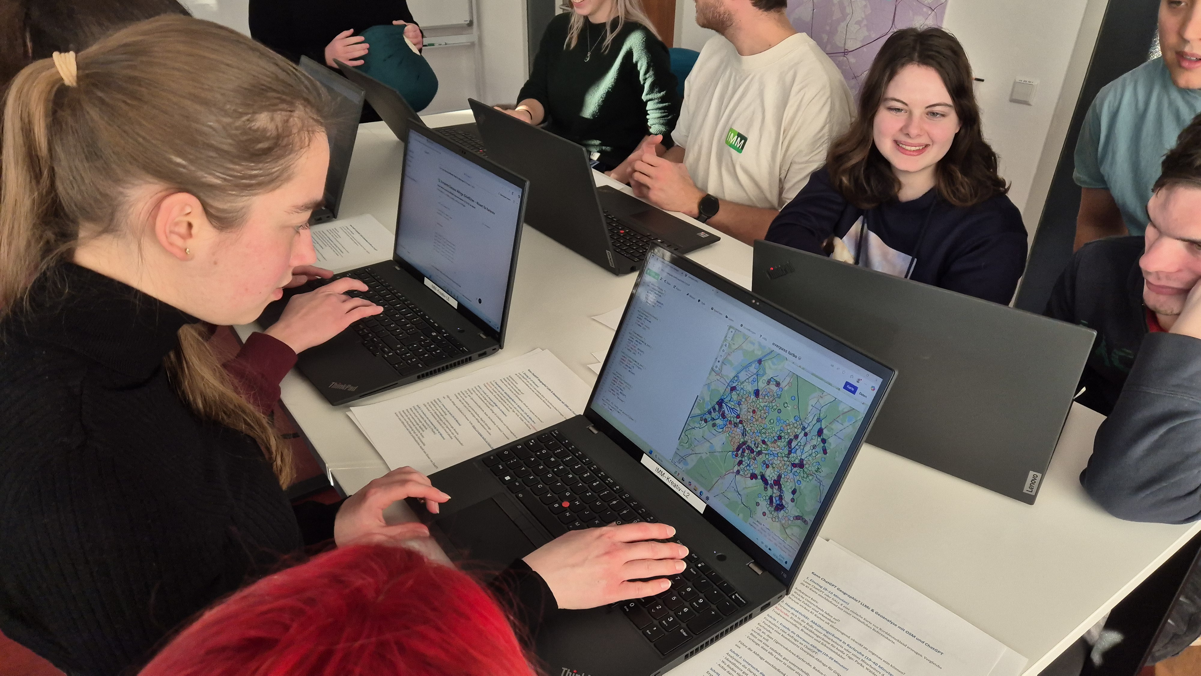 Genau das wollten wir in unserem Workshop am Mittwoch, dem 3. Dezember 2025 herausfinden. Von daher der Titel „Kann ChatGPT Geographie? LLMs & Geoanalyse mit OSM und ChatGPT“. Dafür trafen sich neun Studierende (fast alle von Geo) mit uns im Kreativraum. Gemeinsam haben wir getestet, wie gut ChatGPT typische Aufgaben unterstützt: etwa die Kartenerstellung, den Umgang mit Open Source Geodaten oder die Auswertung von Satellitenbildern. Auch vortrainierte Modelle (sogenannte GPT) wurden ausprobiert. Beim Experimentieren wurde schnell deutlich, dass es viel Erfahrung im „Training“ von LLMs nötig ist, um überzeugende, korrekte Ergebnisse zu erzielen.