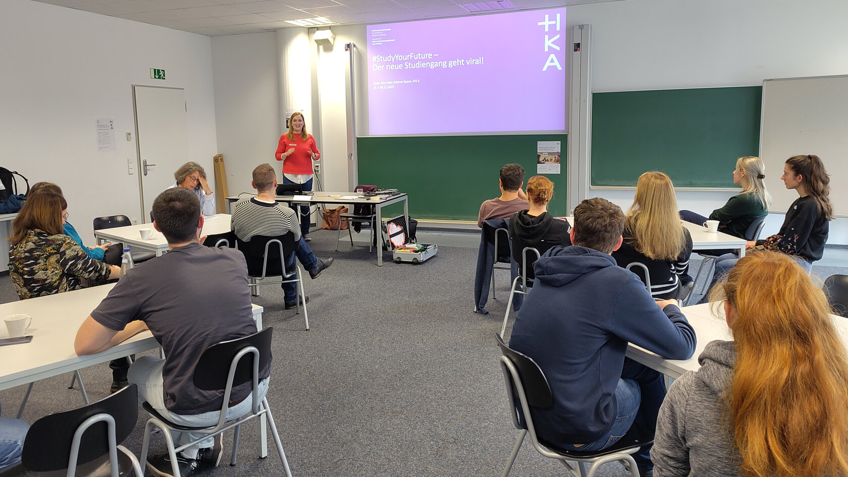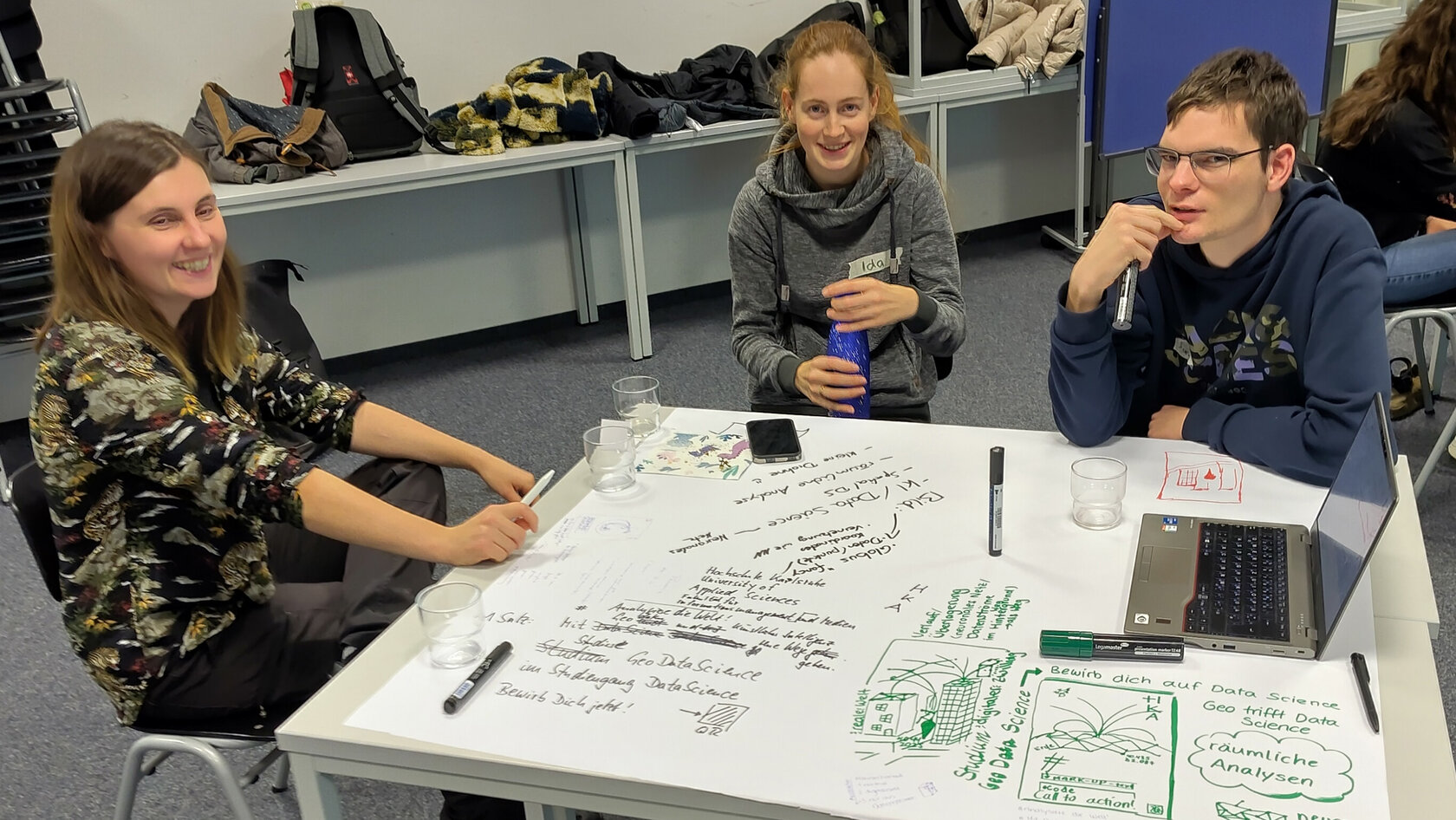 Die kreativen Ideen reichten von zwei Entwürfen für ein Poster, bei dem das Thema „Datenanalyse” visuell umgesetzt werden soll, bis hin zu einem „Carousel-Post”, der die Geschichte eines Studieninteressierten erzählt, dessen Entscheidung für den Studiengang durch den Raumbezug von Daten beeinflusst wird. Auch Guerillamarketing-Ideen kamen auf den Tisch – darunter ein Sticker, der das breite Anwendungsspektrum der Vertiefungsrichtung betont (die andere Idee bleibt noch geheim!). Ein weiteres Highlight war die Entwicklung eines Reels, das auf die Bedeutung des Raumbezugs von Daten hinweist: 80% der Daten haben einen räumlichen Bezug, der jedoch bisher nur zu 10% genutzt wird.