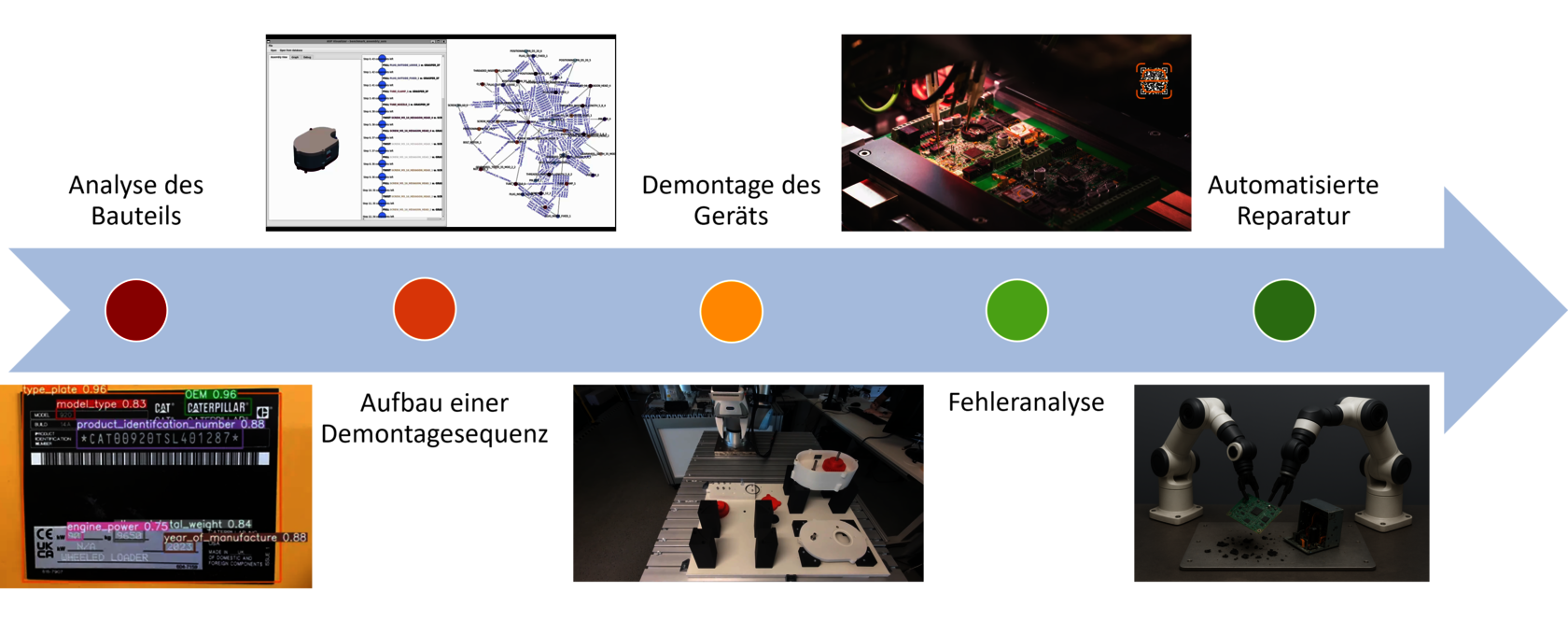 Eine modulare Roboterzelle mit Dual-Arm-Manipulator, KI-gestützter Fehlerdiagnose, adaptiven Greifsystemen und flexibler Sequenzplanung ermöglicht die Automatisierung zentraler Reparaturschritte. Ergänzend entsteht eine skalierbare Reparaturdatenbank, die Expertenwissen strukturiert abbildet. Die Ergebnisse sollen auf weitere Industrie- und Consumerprodukte übertragbar sein und erhebliches ökologisches und ökonomisches Einsparpotenzial erschließen.