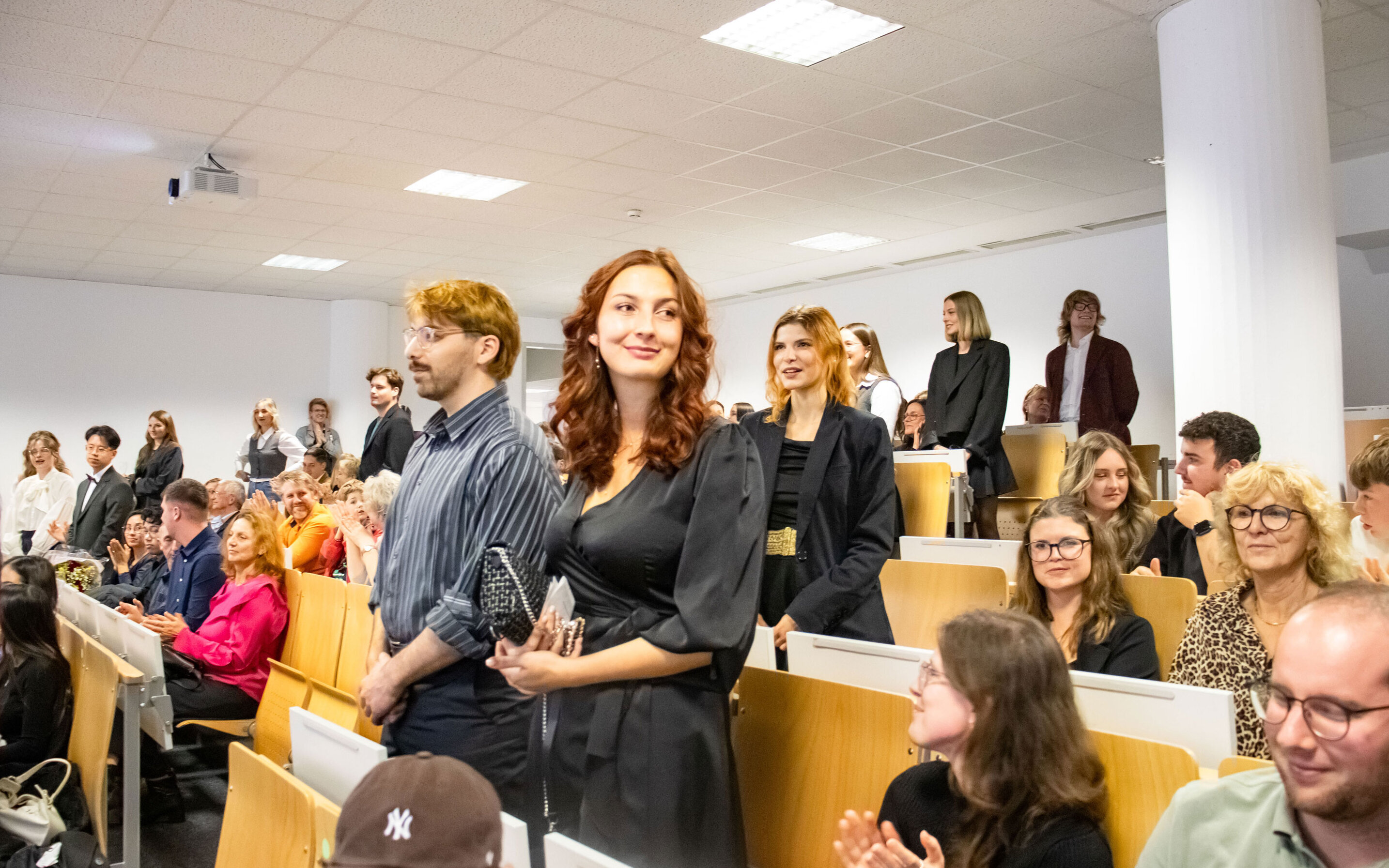 Im Anschluss wurden alle Bachelor- und Master-Absolventinnen und -Absolventen einzeln geehrt, erhielten eine Rose und wurden für ein Erinnerungsfoto auf die Bühne gebeten. Beim anschließenden Get-Together mit Häppchen und Getränken wurde gelacht, gefeiert und auf die gemeinsame Studienzeit angestoßen – ein rundum gelungener Abschluss eines bedeutenden Lebensabschnitts.