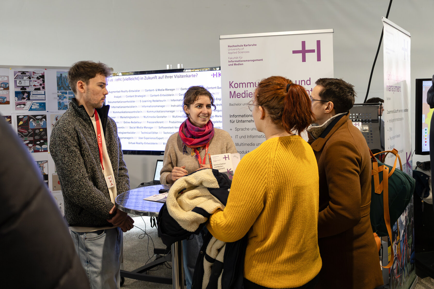 Der Tag bot den Besucher:innen nicht nur Einblicke in Inhalte und Berufsperspektiven der Studiengänge, sondern auch die Möglichkeit, mit Studierenden und Lehrenden ins Gespräch zu kommen. Beim interaktiven Mobilitätscheck des Studiengangs Verkehrssystemmanagement konnten die Besucher:innen ihr Wissen zu Verkehrsthemen testen. Das Ausstellungsstück „Energy Slave“ der Informationsdesigner:innen zeigte anschaulich, wofür die Energie einer Minute Radfahrens genutzt werden kann. Mit der VR-Brille aus dem Studiengang Kommunikation und Medienmanagement war zudem ein kurzer virtueller Ausflug nach Ägypten möglich.