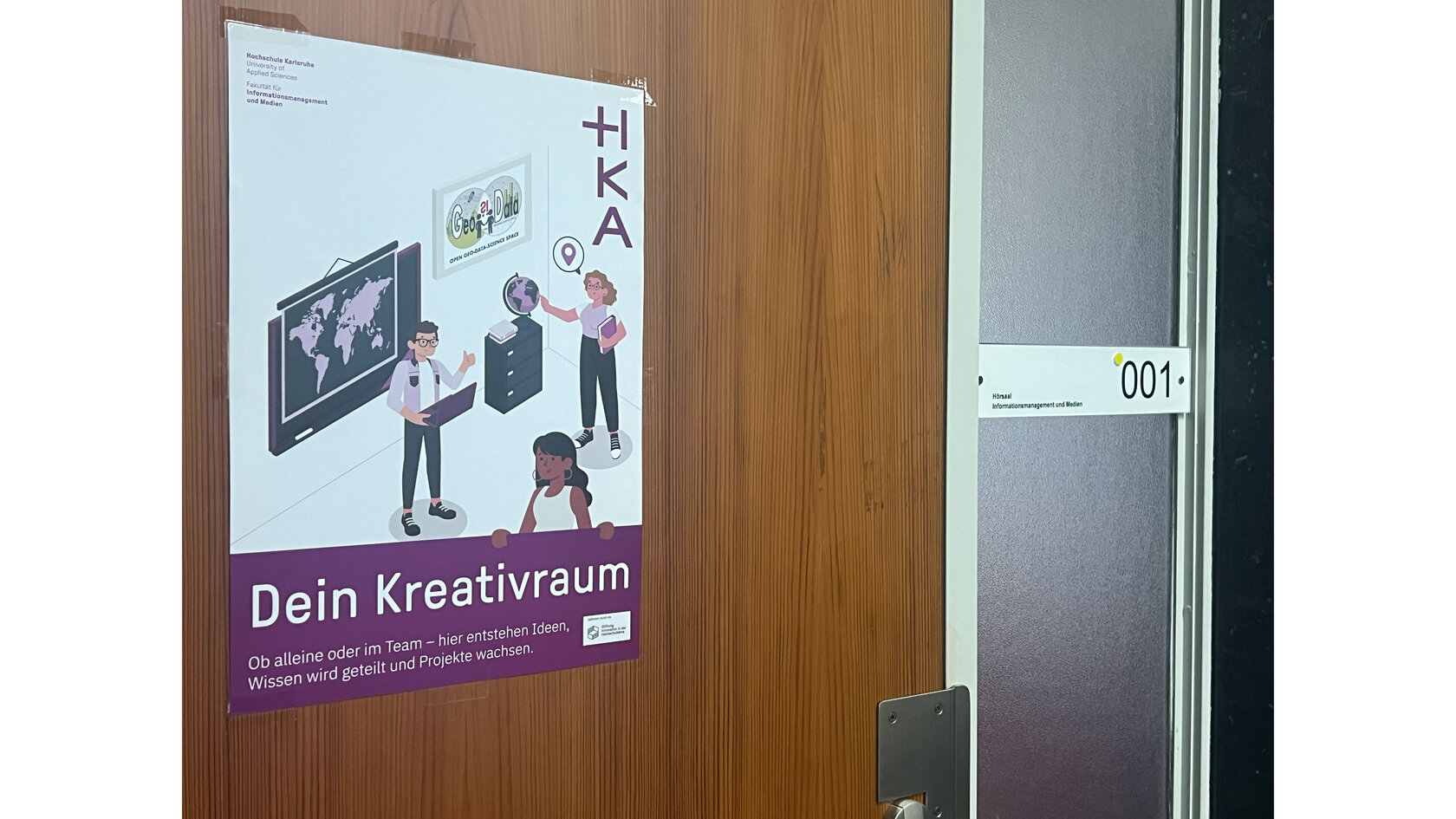 Unsere studentischen Hilfskräfte haben sich auch bei der Dekoration ins Zeug gelegt: An sich gegenüberliegenden Wänden findest Du Fotos vom OGDSS-Projekt sowie Beispiele von Studienarbeiten mit Raumbezug. Außerdem haben wir eine Karte von Karlsruhe aufgehängt, worauf Du mit den bereitgestellten Pins Deine Lieblingsorte markieren und somit teilen kannst.