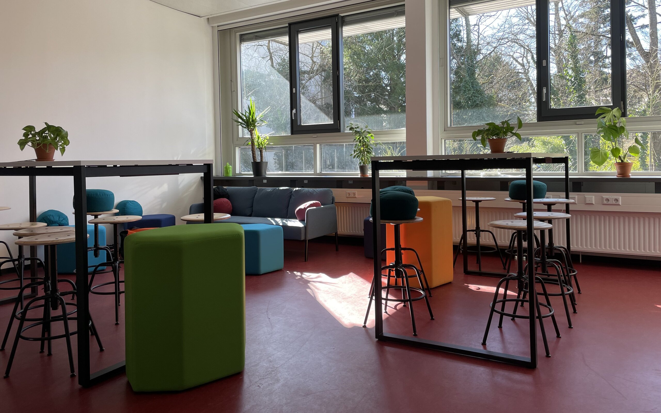 Gleich links, wenn man das Gebäude der Fakultät IMM in der Hoffstraße betritt, befindet sich unser Kreativraum. Ein farbenfroher, offener Raum, der allen Studierenden zur freien Nutzung zur Verfügung steht – außer wenn darin Lehrveranstaltungen stattfinden. Wir laden Dich herzlich ein, hier Zeit zum Arbeiten, Diskutieren und Vernetzen mit Kommiliton*innen zu verbringen.